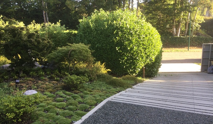Le jardin, inspiré du style japonisant, est un véritable havre de paix qui invite à la contemplation. Des végétaux persistants taillés en topiaire, des érables du Japon et des bambous non-traçants apportent une touche de raffinement et de sérénité. Des mousses, caractéristiques de ce style, viennent compléter cette végétation soignée. Quelques blocs de pierre, placés avec soin, ajoutent du relief et du caractère , tout en respectant l’harmonie du lieu. Pour sublimer cet ensemble, des totems en provenance de contrées lointaines sont stratégiquement intégrés, créant un contraste fascinant avec la végétation et apportant une dimension artistique et culturelle au jardin. L’aménagement allie ainsi modernité, fonctionnalité et esthétique, pour un espace extérieur aussi pratique que raffiné.